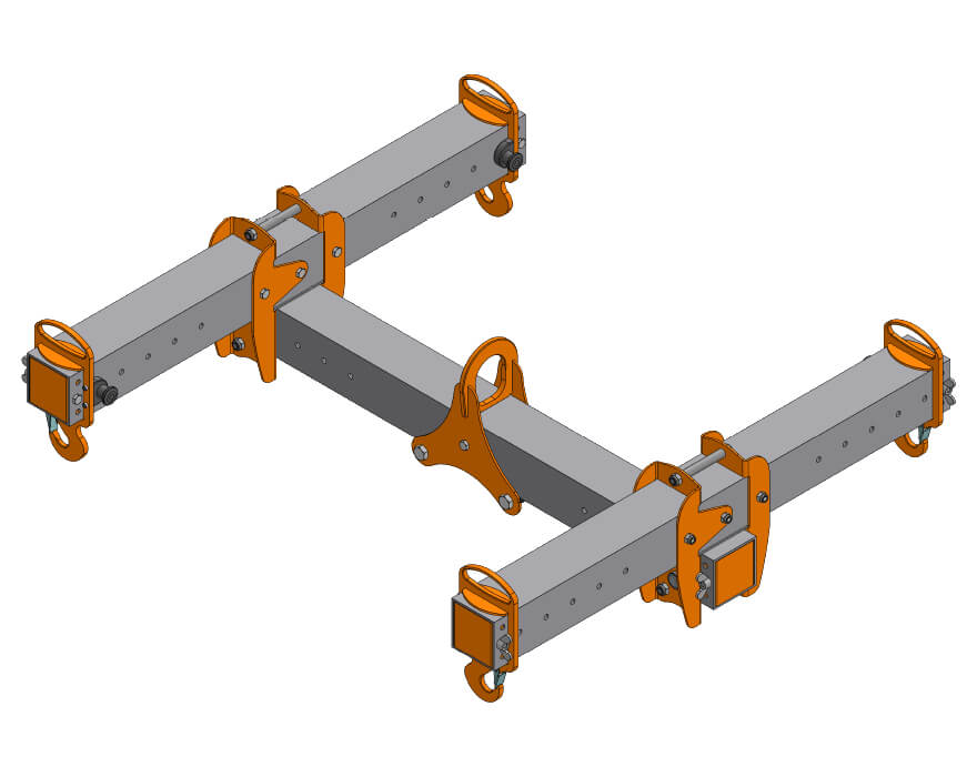 Die verstellbare Alu H-Traverse von Wimag besticht durch ihr äußerst geringes Eigengewicht. Sie ist leicht in der Handhabung und extrem flexibel anzupassen. Die Querträger und Brennhaken können längs der Alu-Profile verschoben werden. Die feine Rasterung entlang der Träger gewährleistet eine präzise Einstellung. Rastbolzen schnappen ein, wenn die gewünschten Abmessungen erreicht sind. So lassen sich Lasten mit außermittigem Schwerpunkt einfach ausrichten und sicher heben.