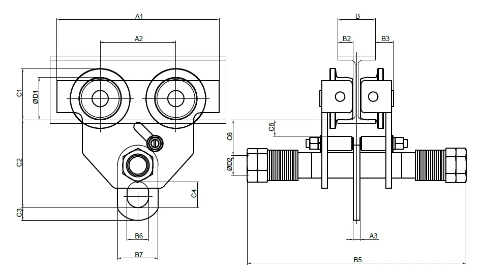 Das Fahrwerk ist für den Einsatz auf genormten Trägern mit geneigten oder parallelen Flanschen ausgelegt. Es verfährt die Last durch Schieben an der Last und ist mit Laufrollen aus Edelstahl mit wartungsfreien Wälzlagern, Seitenschildern aus Edelstahl mit integrierten Radbruchstützen sowie einem Lastbolzen aus Edelstahl aufgebaut.