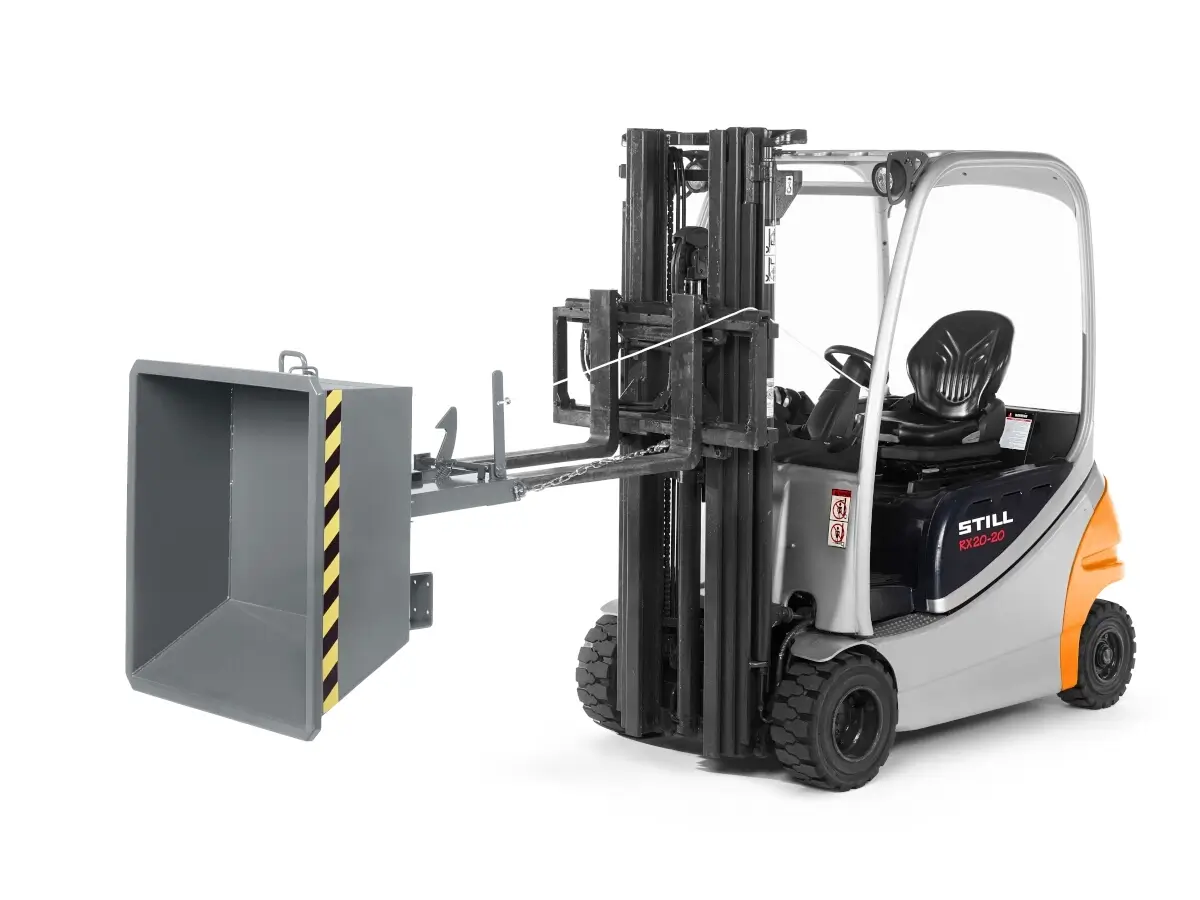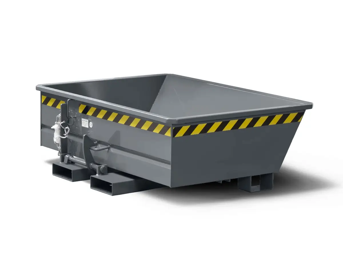 Der Minikipper Typ RMI ist dank seiner kompakten Abmessungen und niedriger Bauhöhe der ideale Kippbehälter in der Produktion, in engen Gängen und unter großen Maschinen. Da Platz an diesen Orten oft knapp ist, bietet sich der Einsatz von Minikippern als Transportgerät für Schrott , oder schüttbare Materialien wie Kleinteile oder Späne an. Der Minikippbehälter ist aus 3mm Stahlblech gefertigt und zeichnet sich daher durch eine sehr robuste Bauweise aus. Er ist außerdem bequem via Seilzug vom Stapler aus zu entriegeln.