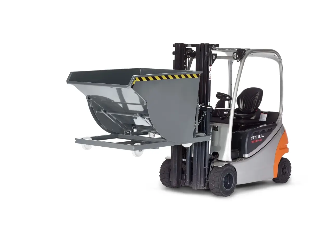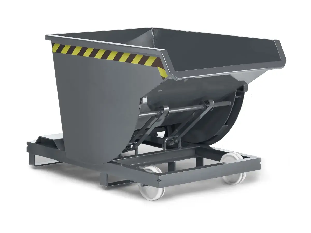 Die Selbstkipper RSK lassen sich mühelos leeren. Beim Auslösen des Seilzugs, zum Beispiel vom Gabelstapler aus, schwenkt die Mulde selbsttätig vor, entleert, schwenkt zurück und verriegelt erneut. Der Kippvorgang läuft über Abrollkufen, was ein staplerschonendes Kippen ermöglicht. Die Selbstkipper sind mit Volumen von 300 bis 1000 Liter erhältlich. Eine zusätzliche Kettensicherung verhindert das Abrutschen von den Gabelzinken, welche eine Mindestlänge von 800 mm aufweisen müssen. Dank eines 3 mm Stahlblechs mit umlaufender Randverstärkung und einer Grundrahmenkonstruktion aus U-Profil mit Querverstärkungen ist der Selbstkipper sehr langlebig und robust. Durch integrierte Rollen im Fahrrahmen erreicht der Kipper auch mit Radsatz eine extrem niedrige Bauhöhe.