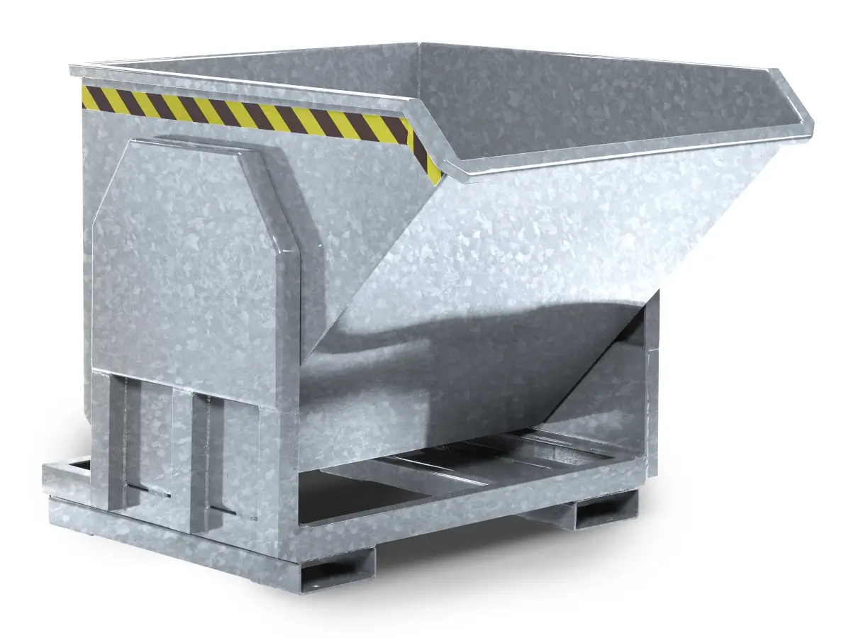 Auch Schwerlastkipper genannt, der zur optimalen Lösung zum Sammeln und Transportieren von schweren Produktionsrohstoffen und Betriebsabfällen dient. Der Behälter kippt selbstständig auf einer Abrollkufe ab, so dass bei der Entleerung kein Schlag auf das Hubgerüst des Staplers entsteht. Die Entriegelung per Seilzug vom Staplersitz spart viel Zeit und ist zudem körperschonend und sicher. Eine zusätzliche Kettensicherung verhindert das Abrutschen von den Gabelzinken. Dank eines 3 mm Stahlblechs mit umlaufender Randverstärkung und einem Grundrahmen aus 6 mm Stahlblech mit Querverstärkung ist der Behälter sehr langlebig und robust.