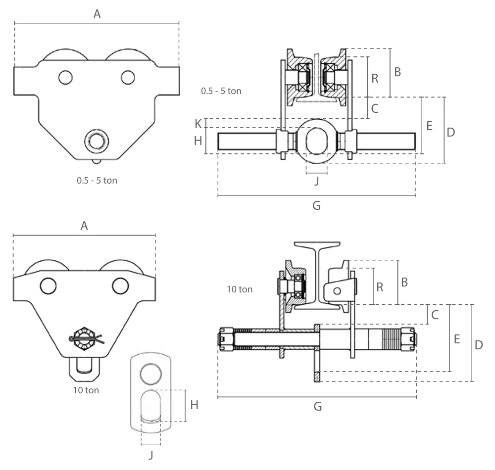 Die Laufkatze ist individuell einstellbar: bei den Ausführungen bis 5.0 t erfolgt die Anpassung komfortabel durch Drehen des Tragbolzens, ab 10.0 t wird die Trägerbreite über Distanzscheiben eingestellt. Sicherheitsbügel fungieren als Absturzsicherung, Radbruch- und Aufprallschutz, ergänzt durch einen serienmäßigen Kippschutz. Dauerhaft geschmierte, kugelgelagerte Räder ermöglichen ein sanftes, gleichmäßiges Verfahren der Last entlang des Trägers.