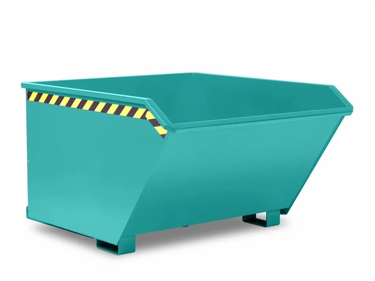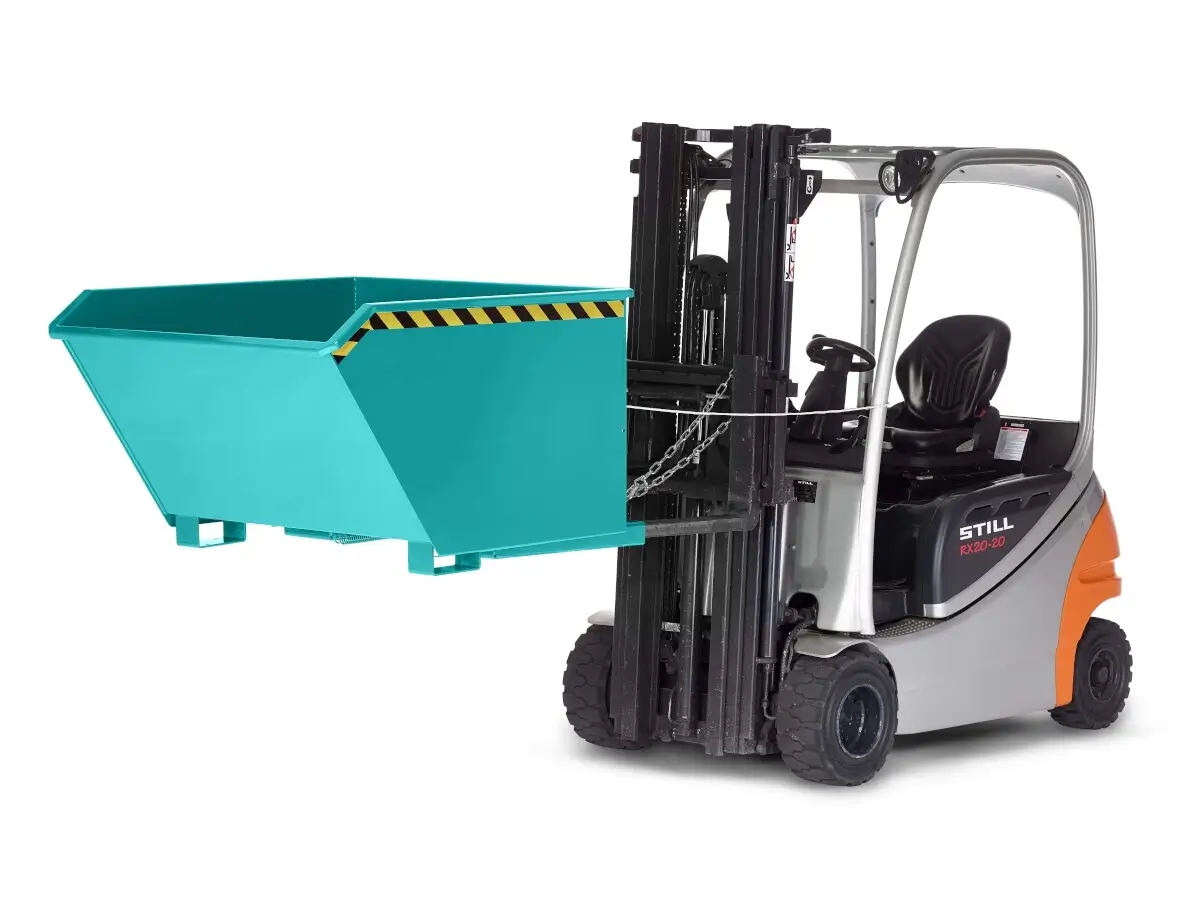 Der Universalkippbehälter RUK dient zum Sammeln und Transportieren von Schüttgütern aller Art. Durch seine niedrige Bauhöhe ist er ideal als Beistell-Behälter an jeder Maschine geeignet. Die Abfangschere mit Zugfeder zwischen Behälterboden und Grundrahmen ermöglicht eine reibungslose Entleerung der Schüttgüter. Die Entriegelung per Seilzug vom Staplersitz spart viel Zeit und ist zudem körperschonend und sicher. Eine zusätzliche Kettensicherung verhindert das Abrutschen von den Gabelzinken. Dank eines 3mm Stahlblechs mit umlaufender Randverstärkung und einem Grundrahmen aus 6mm Stahlblech mit Querverstärkung ist der Behälter sehr langlebig und robust.