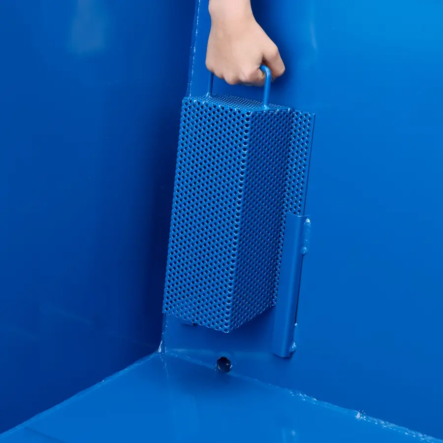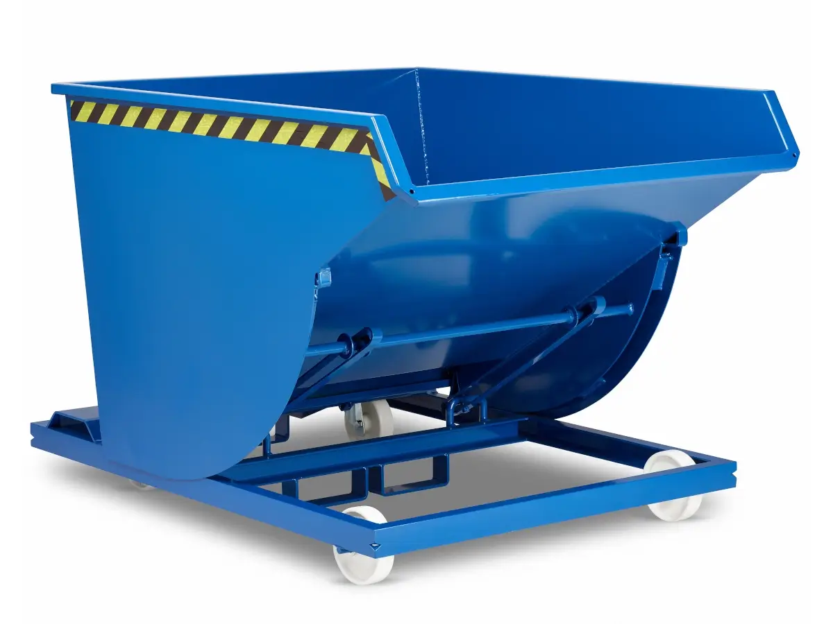 Die Spänekipper RSK-S verfügen über einen Siebblockeinsatz und einen Ablasshahn zum Trennen von Flüssigkeiten von Feststoffen. Das Sieb lässt sich zur Reinigung einfach entfernen. Der Entleerungsvorgang ist spielend leicht. Beim Auslösen des Seilzugs, beispielsweise vom Staplersitz aus, schwenkt die Mulde selbsttätig vor, entleert, schwenkt zurück und verriegelt erneut. Der Kippvorgang läuft über Abrollkufen, was ein staplerschonendes Kippen ermöglicht.