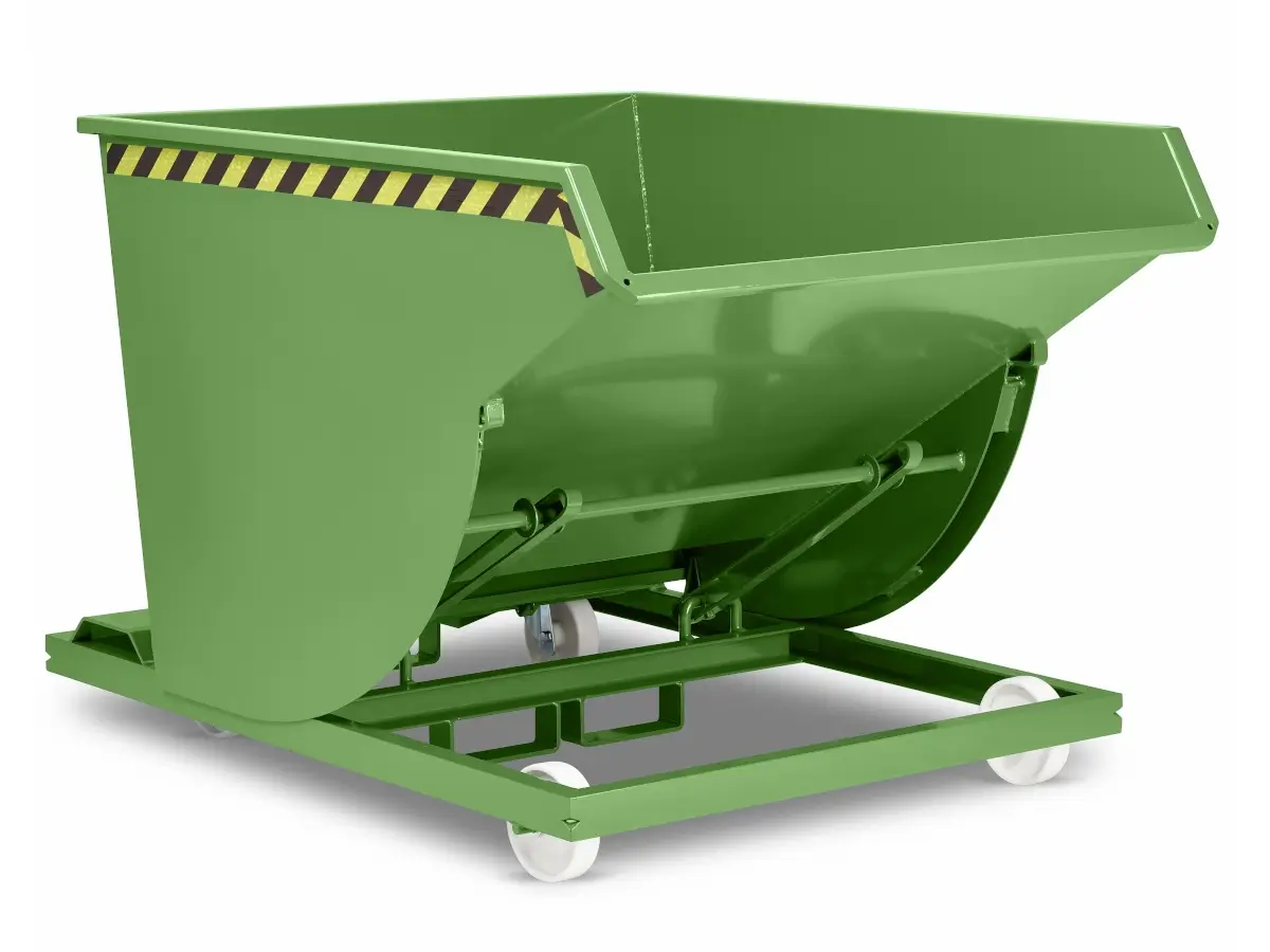 Die Spänekipper sind mit Volumen von 300 bis 1000 Liter erhältlich und sind öl- und wasserdicht verschweißt. Eine zusätzliche Kettensicherung verhindert das Abrutschen von den Gabelzinken, welche eine Mindestlänge von 800 mm aufweisen müssen. Dank eines 3 mm Stahlblechs mit umlaufender Randverstärkung und einer Grundrahmenkonstruktion aus U-Profil mit Querverstärkungen ist der Selbstkipper sehr langlebig und robust. Im Fahrrahmen integrierte Rollen machen den Spänekipper RSK-S mobil und leicht verfahrbar. Der Kipper verfügt über eine extrem niedrige Bauhöhe.