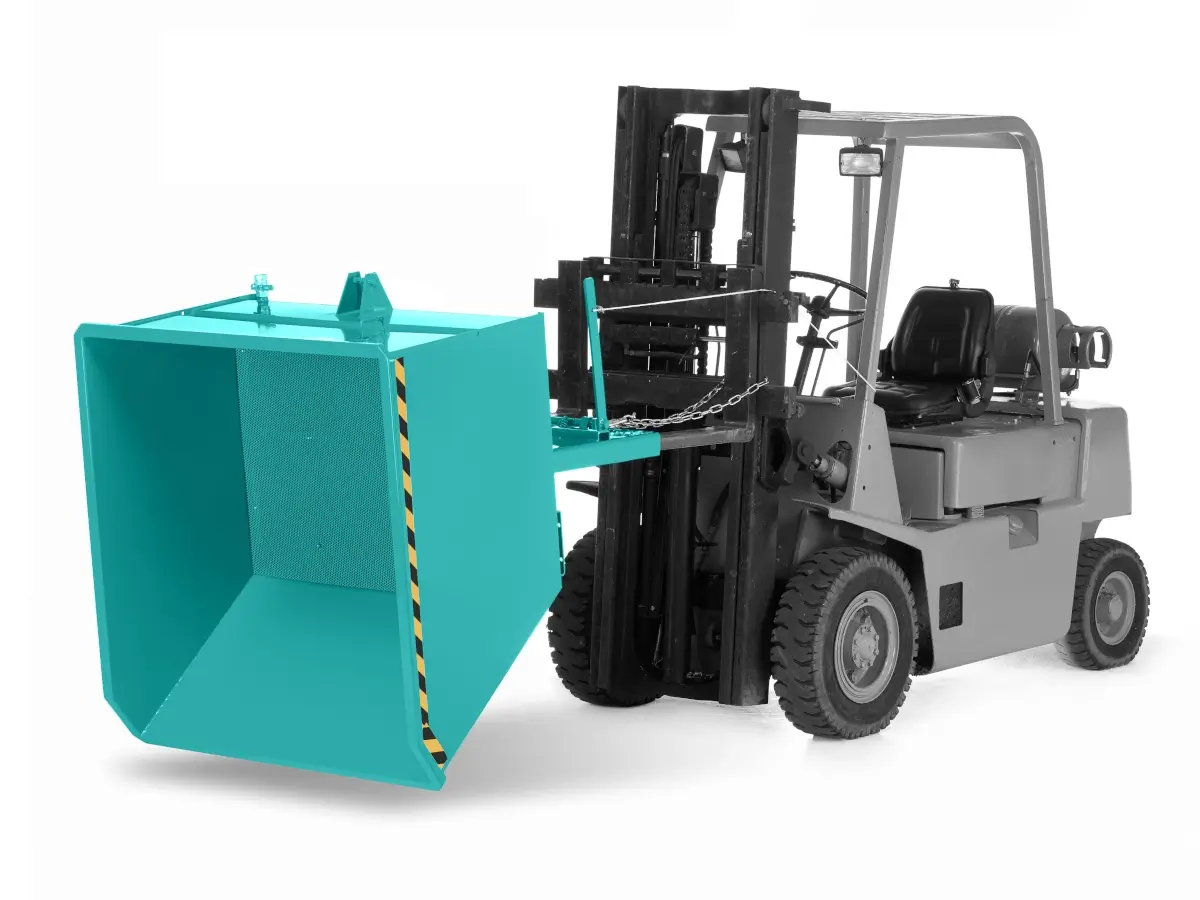 Der Spänekippbehälter RUK-S dient zum Sammeln und Transportieren von Schüttgütern aller Art. Er verfügt über einen Lochblechdoppelboden und einen Ablasshahn zur einfachen Trennung der Flüssigkeiten von Feststoffen. Der Doppelboden lässt sich zur einfachen Reinigung entfernen. Durch seine niedrige Bauhöhe ist er ideal als Beistell-Behälter an jeder Maschine geeignet. Die Abfangschere mit Zugfeder zwischen Behälterboden und Grundrahmen ermöglicht eine reibungslose Entleerung der Schüttgüter. Die Entriegelung per Seilzug vom Staplersitz spart viel Zeit und ist zudem körperschonend und sicher. Eine zusätzliche Kettensicherung verhindert das Abrutschen von den Gabelzinken. Dank eines 3 mm Stahlblechs mit umlaufender Randverstärkung und einem Grundrahmen aus 6 mm Stahlblech mit Querverstärkung ist der Behälter sehr langlebig und robust.