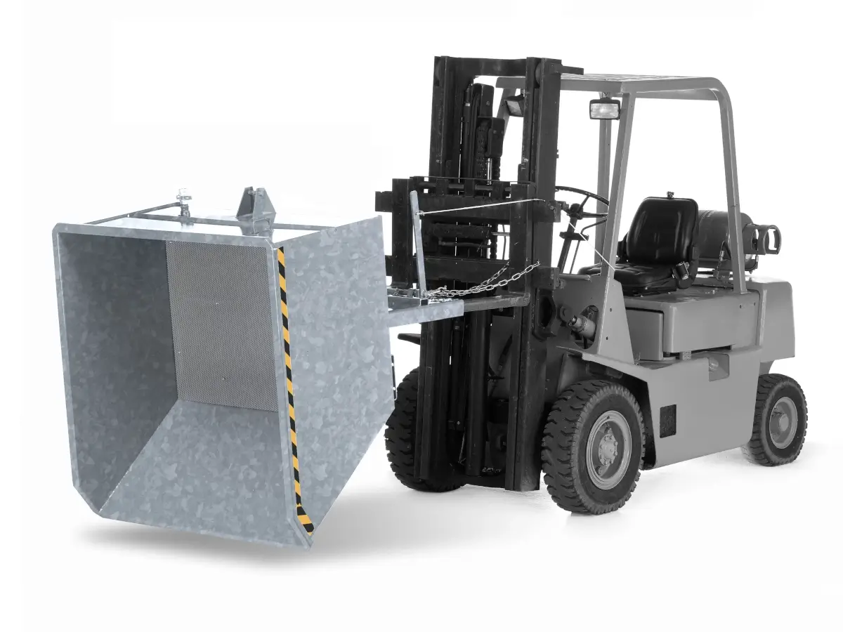 Der Spänekippbehälter RUK-S dient zum Sammeln und Transportieren von Schüttgütern aller Art. Er verfügt über einen Lochblechdoppelboden und einen Ablasshahn zur einfachen Trennung der Flüssigkeiten von Feststoffen. Der Doppelboden lässt sich zur einfachen Reinigung entfernen. Durch seine niedrige Bauhöhe ist er ideal als Beistell-Behälter an jeder Maschine geeignet. Die Abfangschere mit Zugfeder zwischen Behälterboden und Grundrahmen ermöglicht eine reibungslose Entleerung der Schüttgüter. Die Entriegelung per Seilzug vom Staplersitz spart viel Zeit und ist zudem körperschonend und sicher. Eine zusätzliche Kettensicherung verhindert das Abrutschen von den Gabelzinken. Dank eines 3 mm Stahlblechs mit umlaufender Randverstärkung und einem Grundrahmen aus 6 mm Stahlblech mit Querverstärkung ist der Behälter sehr langlebig und robust.