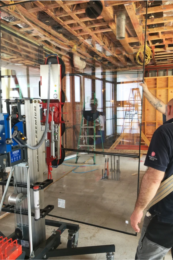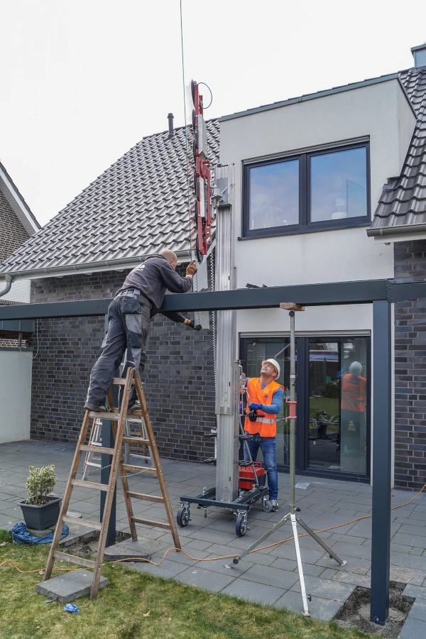 Der kompakte Materiallift WLU /Ks inkl. Kontergewichten in kurzer Bauweise wird mit Standardgabel gezeigt, mit Lastaufnahmemittel und Saugnäpfen zur Aufnahme von Glasscheiben und beim Aufbau eines Wintergartens.