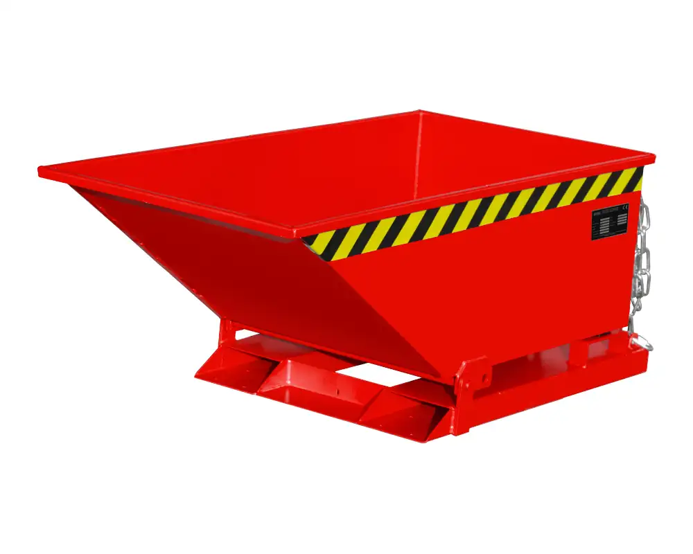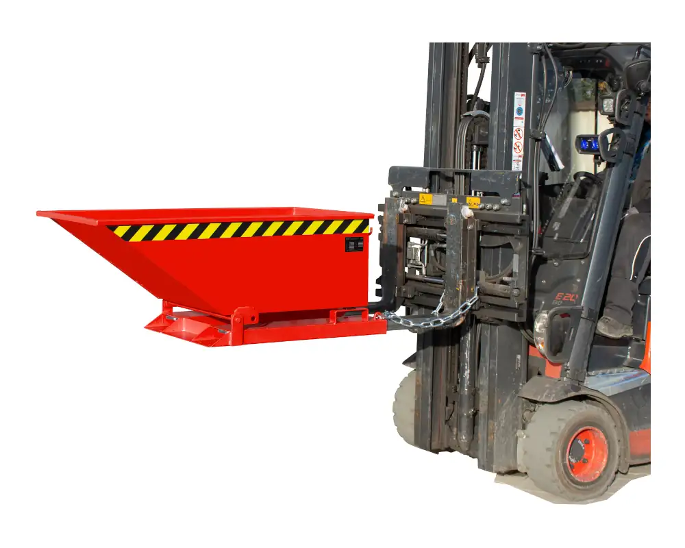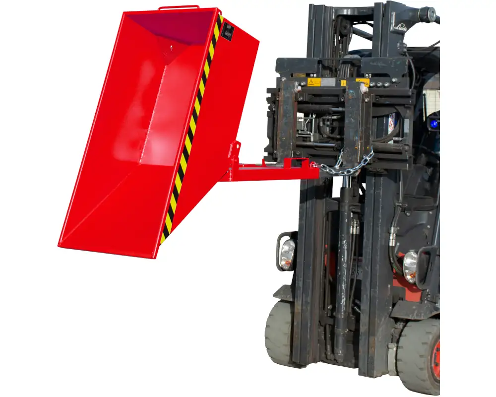 Die Späne-Kippmulde Typ SKN findet mit ihrer niedrigen Bauart leicht unter spanabhebenden Maschinen oder Späneförderern Platz. Sie ist speziell auf das Sammeln und Entsorgen von Metallspänen ausgelegt. Ihre Mulde ist serienmäßig öl- und wasserdicht verschweißt und verfügt über ein Siebblech, um die Feststoffe von den Flüssigkeiten zu trennen. Mit Kühlschmierstoffen verunreinigte Späne können in ihr sicher aufgefangen und zwischengelagert werden. Die Emulsion lässt sich über einen integrierten Abfluss ablassen. Im Grundrahmen verbaute Einfahrtaschen ermöglichen die Aufnahme mit einem Gabelstapler. Während des Transports wird der Behälter über eine Kette am Hubmast des Staplers gegen Abrutschen gesichert. Die Mulde ist auf dem Grundrahmen kippbar gelagert. Die Entleerung erfolgt von Hand. Hierfür ist auf der Rückseite des Behälters ein Griff vorgesehen, der das manuelle Kippen erleichtert.