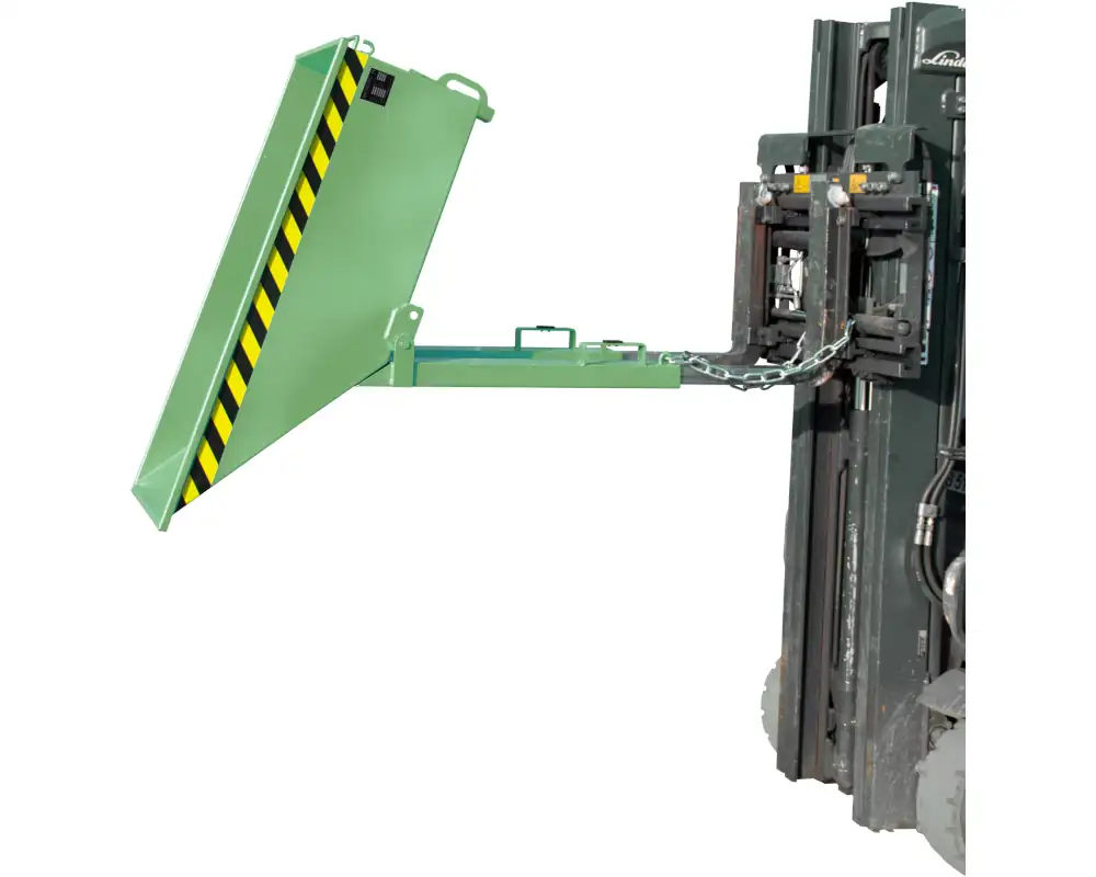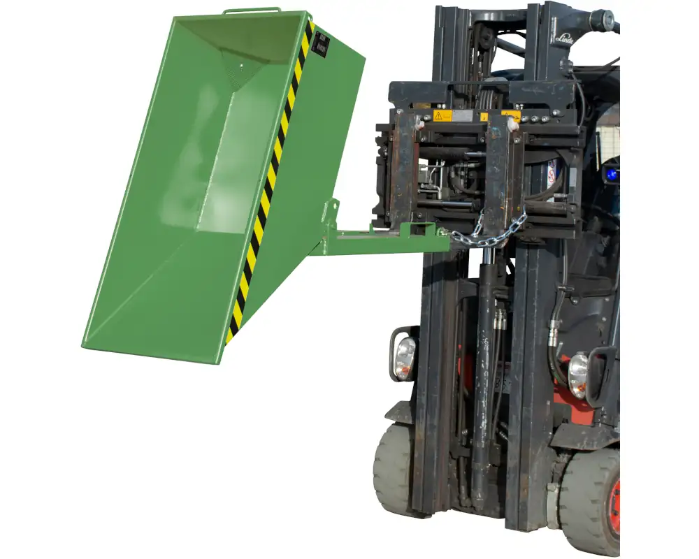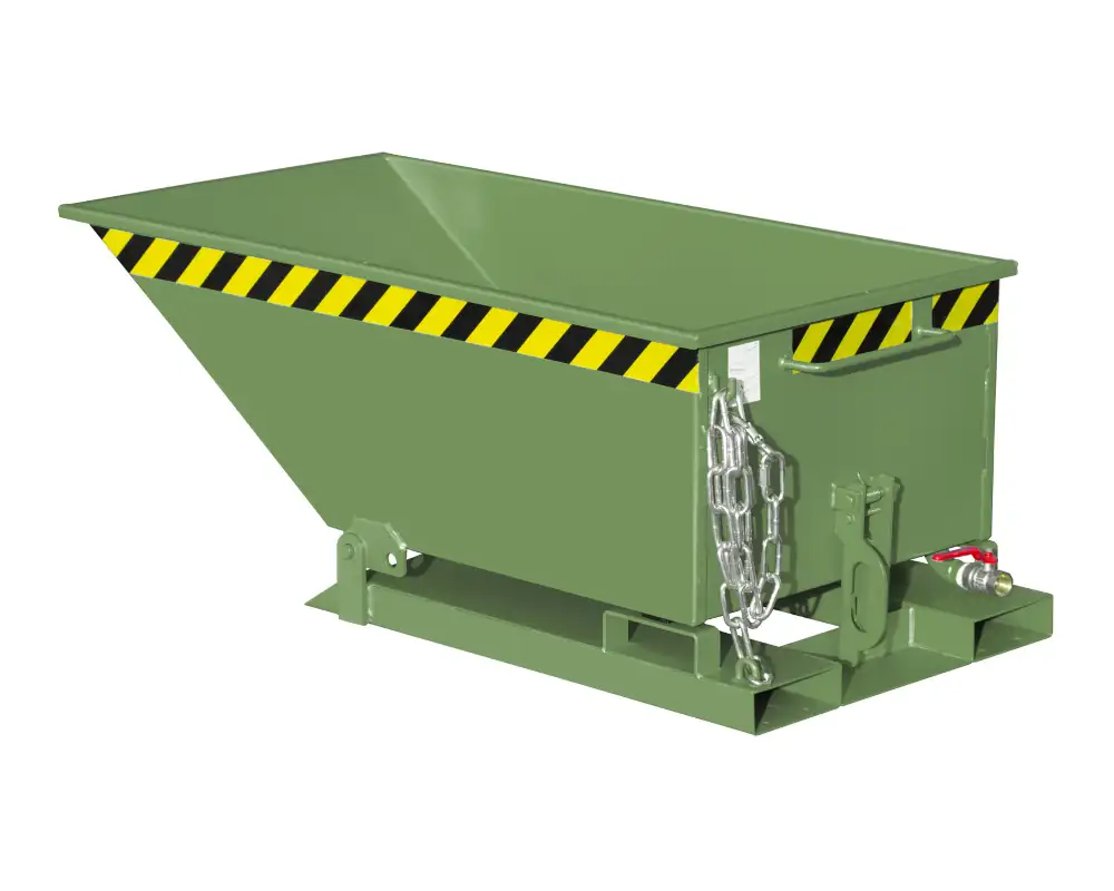 Die Späne-Kippmulde Typ SKN findet mit ihrer niedrigen Bauart leicht unter spanabhebenden Maschinen oder Späneförderern Platz. Sie ist speziell auf das Sammeln und Entsorgen von Metallspänen ausgelegt. Ihre Mulde ist serienmäßig öl- und wasserdicht verschweißt und verfügt über ein Siebblech, um die Feststoffe von den Flüssigkeiten zu trennen. Mit Kühlschmierstoffen verunreinigte Späne können in ihr sicher aufgefangen und zwischengelagert werden. Die Emulsion lässt sich über einen integrierten Abfluss ablassen. Im Grundrahmen verbaute Einfahrtaschen ermöglichen die Aufnahme mit einem Gabelstapler. Während des Transports wird der Behälter über eine Kette am Hubmast des Staplers gegen Abrutschen gesichert. Die Mulde ist auf dem Grundrahmen kippbar gelagert. Die Entleerung erfolgt von Hand. Hierfür ist auf der Rückseite des Behälters ein Griff vorgesehen, der das manuelle Kippen erleichtert.