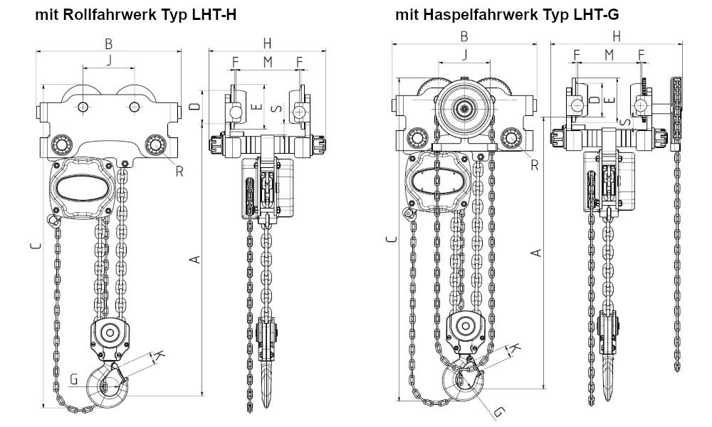 Die LHT-Serie ist in zwei Ausführungen verfügbar: LHT-H als Rollfahrwerk (manuelles Verfahren) und LHT-G als Haspelkettenfahrwerk (Verfahren über Handkette). Beide Varianten werden serienmäßig mit einem PREMIUM Flaschenzug geliefert.