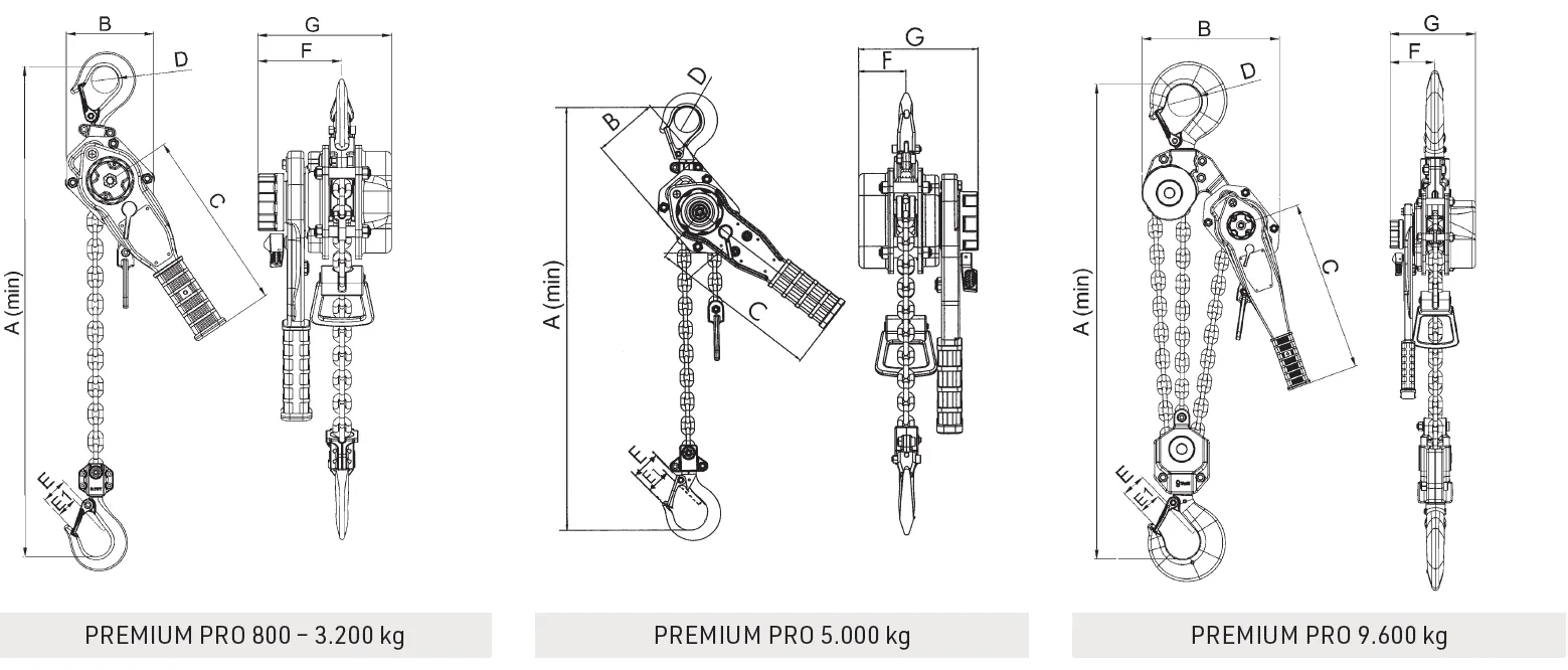 Der Hebelzug PREMIUM PRO ist in Tragfähigkeiten von 800 kg bis 9600 kg verfügbar. Je nach Ausführung unterscheiden sich insbesondere Anzahl der Kettenstränge, Kettengröße, erforderliche Hebelkraft sowie das Gewicht.