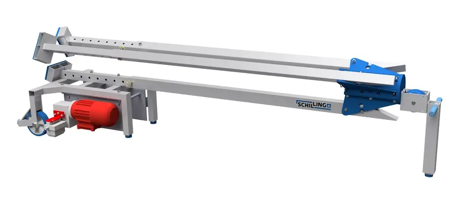 Das integriete Fahrwerk erleichtert das Handling und ermöglicht einen schnellen Standortwechsel. Hierzu wird der Dreibock an seinem Doppel-Handgriff gepackt, das Paket am leichten Ende angehoben und mittels Fahrsatz verrollt.
