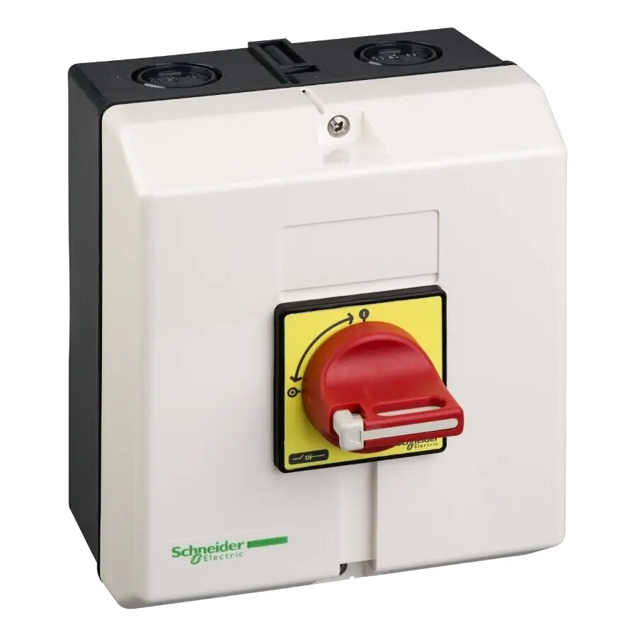TeSys VARIO - Kurzbezeichnung des Geräts: Lasttrennschalter im Gehäuse, Produkt oder Komponententyp: Lasttrennschalter im Gehäuse, Schalterfunktion: Not-Aus - Netzwerktyp: AC - (Ithe) thermischer Strom: 10 A, alle Maschinenanforderungen: DOL Start oder Stop von Motoren, Lastschaltung des Maschinen-Steuerstromkreises.Not-Aus/Hauptschalter, 3P, 690V, 50A, Im Gehäuse. Frontschild 60 x 60 mm. Komplettgerät, 3-polig, IP 65, mit Drehantrieb. Roter Griff, abschließbar mit 3 Vorhängeschlössern DM 4 mm bis DM 8 mm (Lieferung Ohne Vorhängeschlösser). Schalterstellung O I, Frontschild gelb.