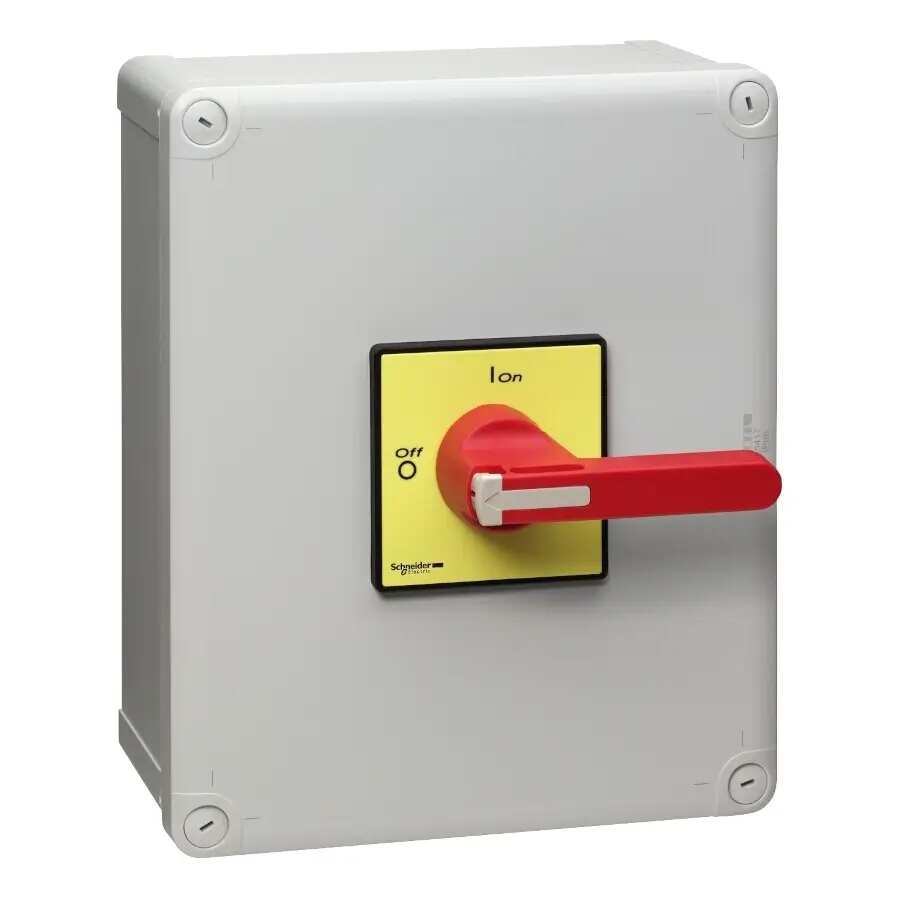 Vario-Trennschalter im Gehäuse VCF 3P, 140 A. Frontschild 90 x 90 mm. Komplettgerät, 3-polig, IP 65, mit Drehantrieb. Roter Griff, abschließbar mit 3 Vorhängeschlössern DM 4 mm bis DM 8 mm (Lieferung Ohne Vorhängeschlösser). Schalterstellung O I, Frontschild gelb.VCF6GEN Not-Aus/Hauptschalter, 3p, 690V,