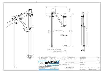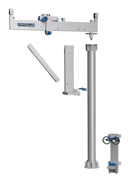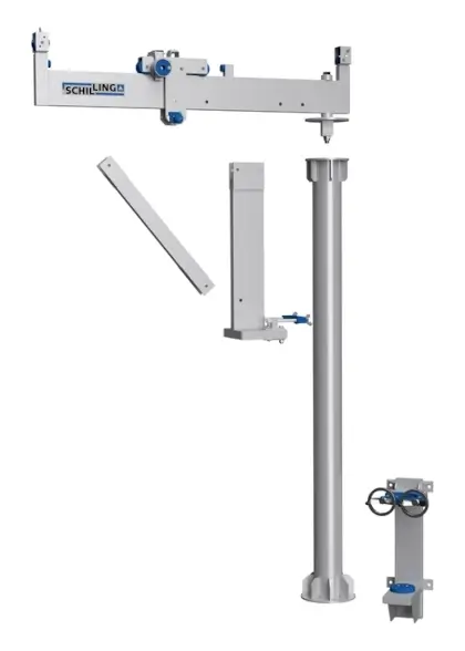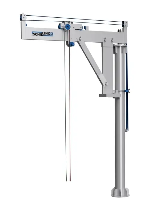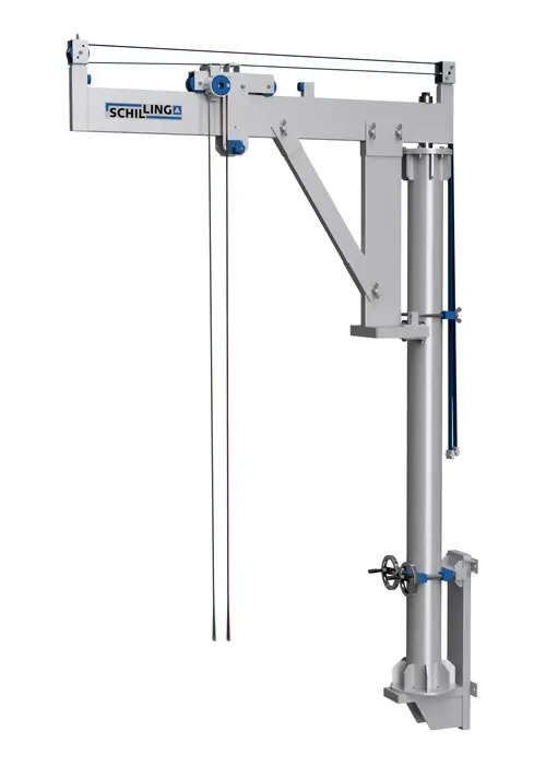 Mit seinem geringen Gewicht ist der Säulenschwenkkran von Schilling leicht zu drehen und die Laufkatze über das Umlaufende-Band gut und sicher zu bedienen. Seine relativ große Bauhöhe ermöglicht lange Hübe. Der Einhängepunkt an der Laufkatze ist immerhin 3000 mm hoch und dient zur Aufnahme elektrischer oder handbetriebener Hebezeuge. Die Laufkatze ist serienmäßig mit einer Feststellvorrichtung ausgestattet mit der sie an jedem gewünschten Ort auf dem Ausleger arretiert werden kann. Endanschläge auf dem Säulenschwenker verhindert ein herabrollen des Rollfahrwerks.