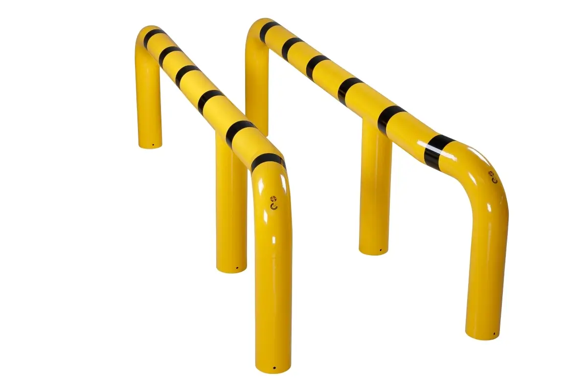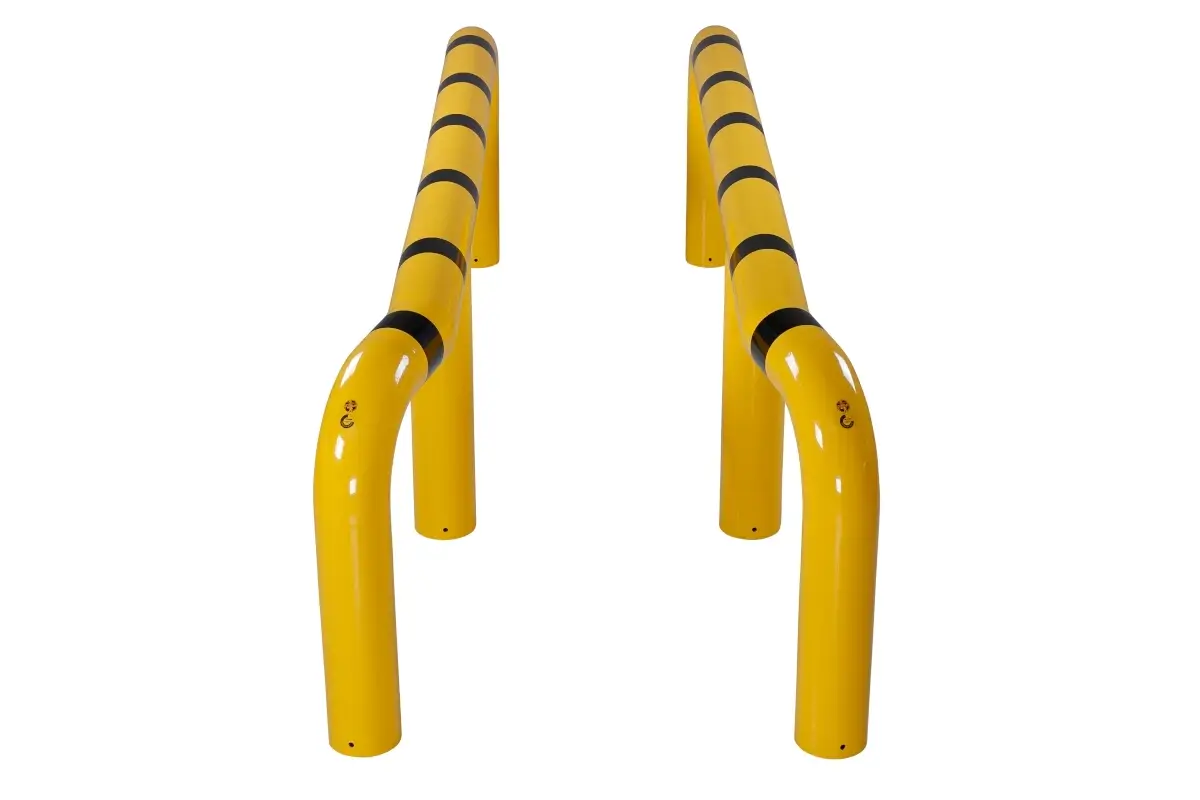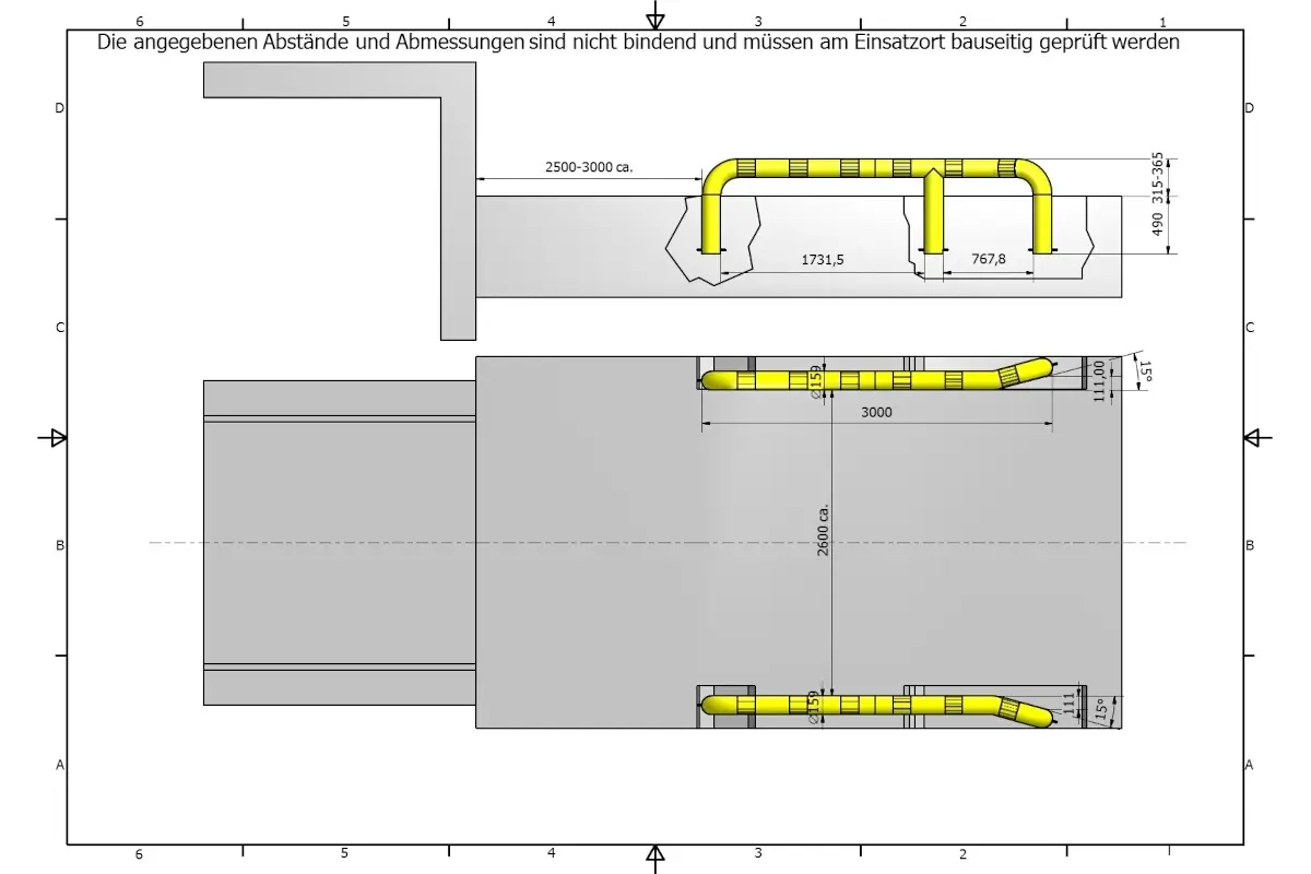 Modulare LKW Einfahrhilfe aus Stahl, gelb-schwarz, zum Einbetonieren, verzinkt und beschichtet, Länge 3000 mm, Höhe über Flur 305 mm, Tiefe unter Flur 550 mm, Einfahrwinkel 15°, 1 Set = 2 Flügel, Gewicht: 150 KG