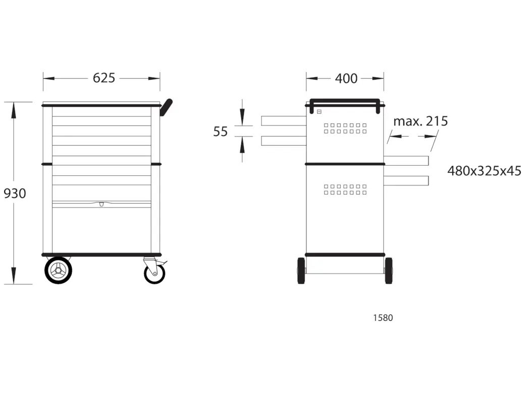 Der Werkzeugwagen 1580 ist ein robustes Werkzeuglagerungssystem mit vielen nützlichen Funktionen. Er ist komplett verschließbar durch beidseitige Metall-Jalousien, die eine zusätzliche Sicherheit für das Werkzeug bieten. Die Arbeitsplattform ist mit einer Abdeckung aus ABS-Kunststoff ausgestattet und die Seitenwände haben eine Euro-Lochung mit einer Größe von 10 x 38 mm.