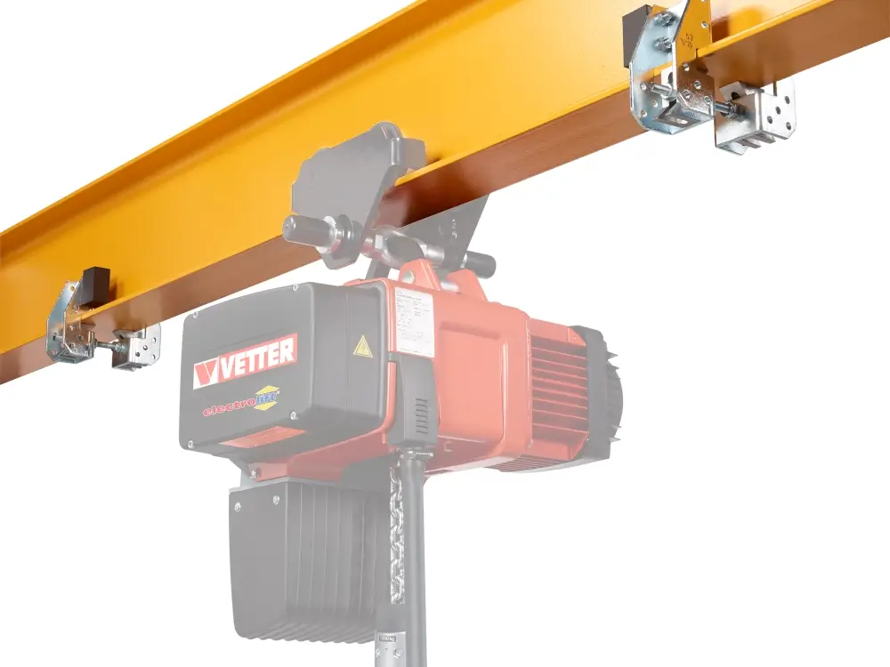 Wir statten alle Ihre Fabrikate bis 10.000 kg Tragfähigkeit aus. Die Klemmpuffer können Sie universell für eine Montage an der unteren oder oberen Trägerlaufbahn einsetzen.