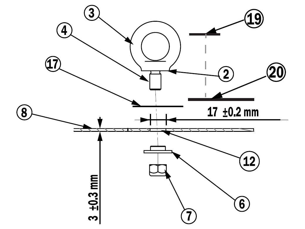Muss an einer Tragstruktur vom Typ „Platte aus Edelstahl oder verzinktem Stahl“ (Pos. 8) mit einer Stärke von 3 +/- 0,3 mm und einer 17er Bohrung +/- 0,2 mm mit einer Mutter und einer Spezialunterlegscheibe (Pos 6, 7) installiert werden, die im Lieferumfang der Anschlageinrichtung enthalten sind.
