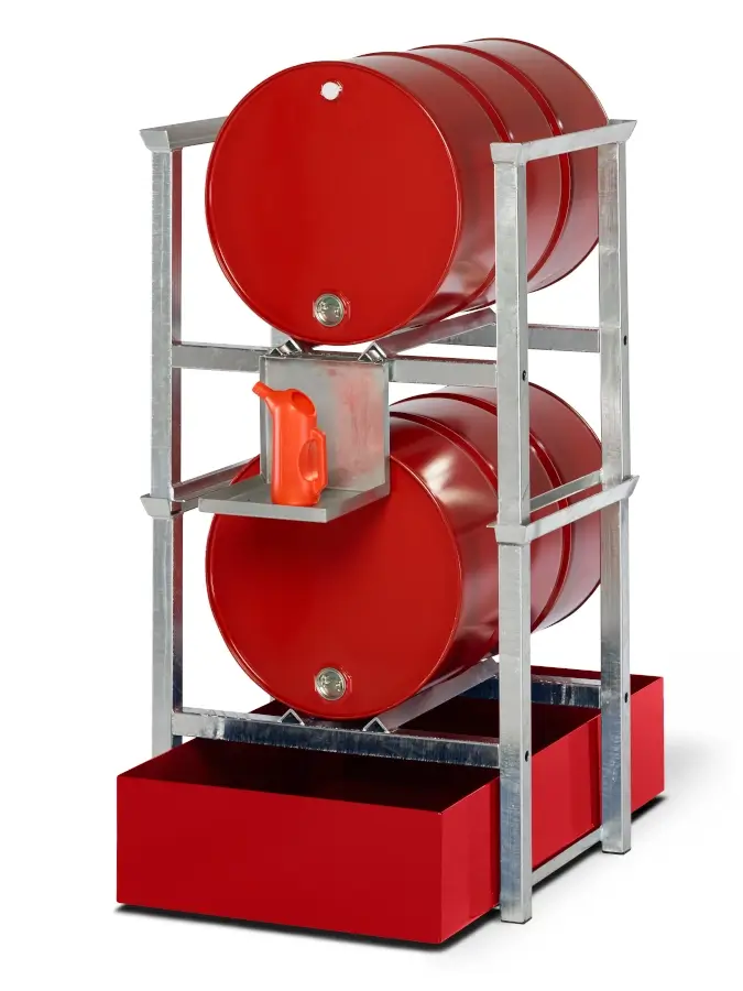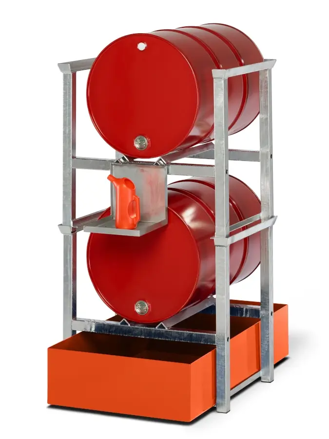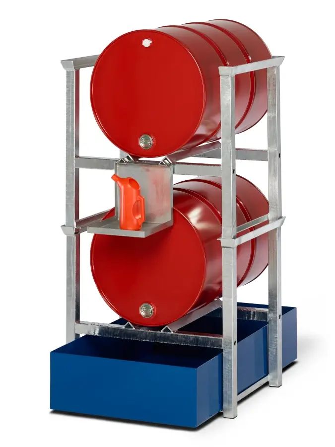 Das Stapelregal ist bis zu 3 Ebenen stapelbar. In Kombination mit einer Auffangwanne ergeben sich raumsparende Umfüllstationen.
