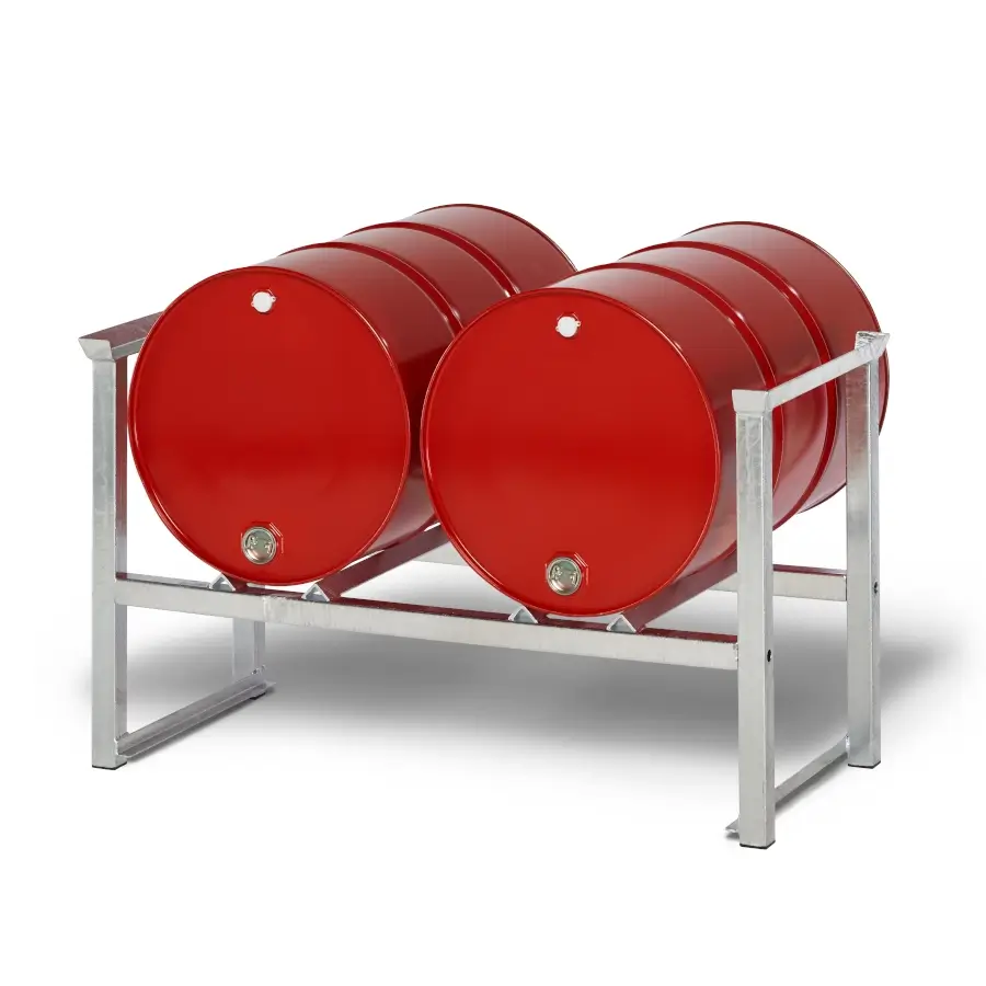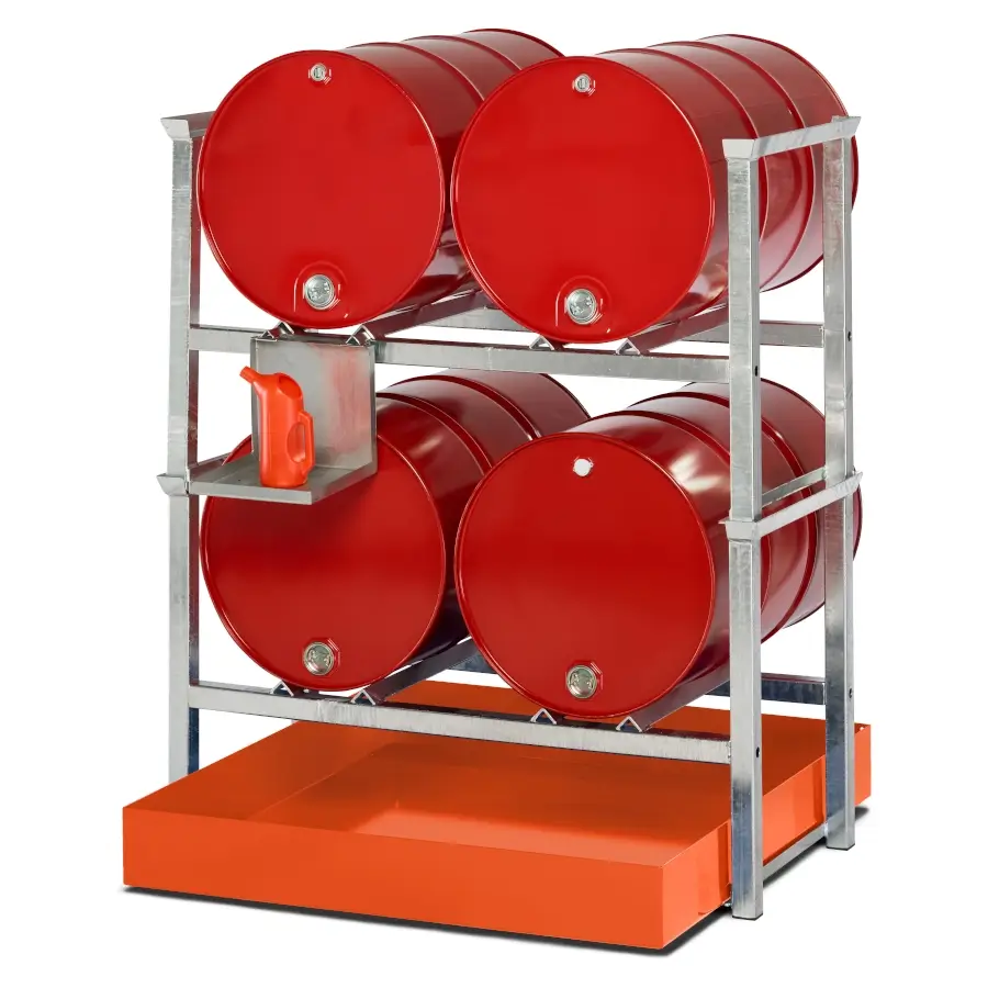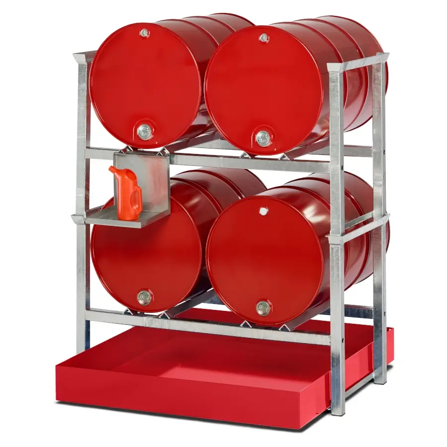 Das Stapelregal ist bis zu 3 Ebenen stapelbar. In Kombination mit einer Auffangwanne ergeben sich raumsparende Umfüllstationen.