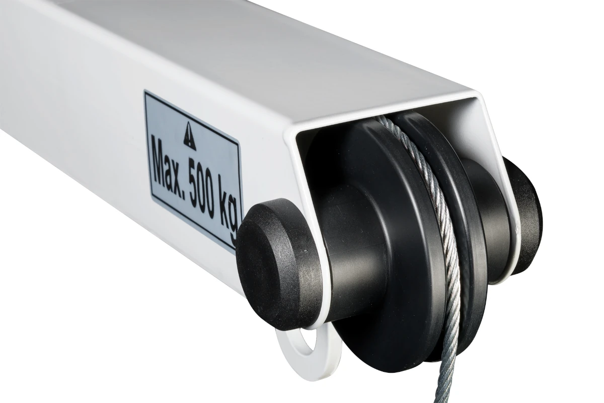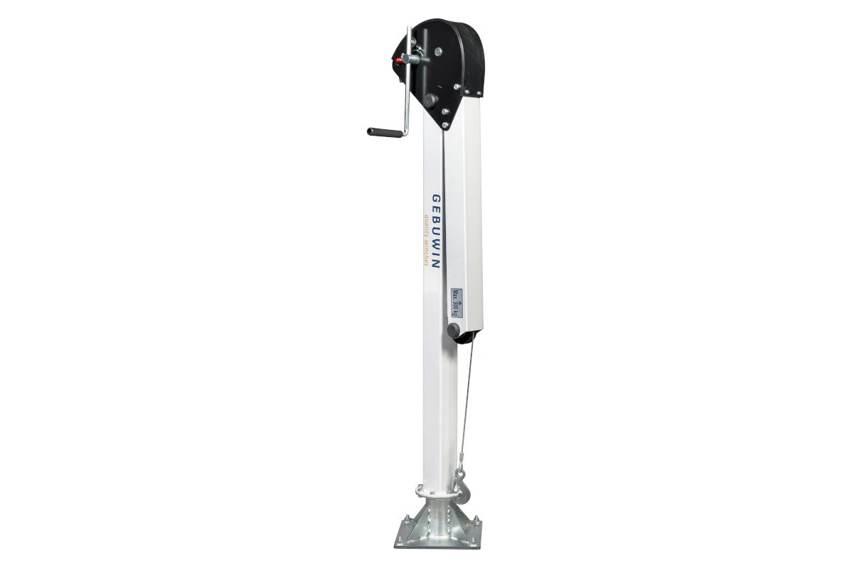 In Kombination mit der mitgelieferten Bodenhülse lässt sich der Davit-Kran um 360° drehen. Gebuwin bietet drei verschiedene Modelle mit variabler Hubkapazität und Auslegerlänge. Die integrierte Winde mit Drahtseil macht den Kran kompakt und wartungsarm. Dank verstellbarer Kurbel kann die Hubgeschwindigkeit flexibel angepasst werden.