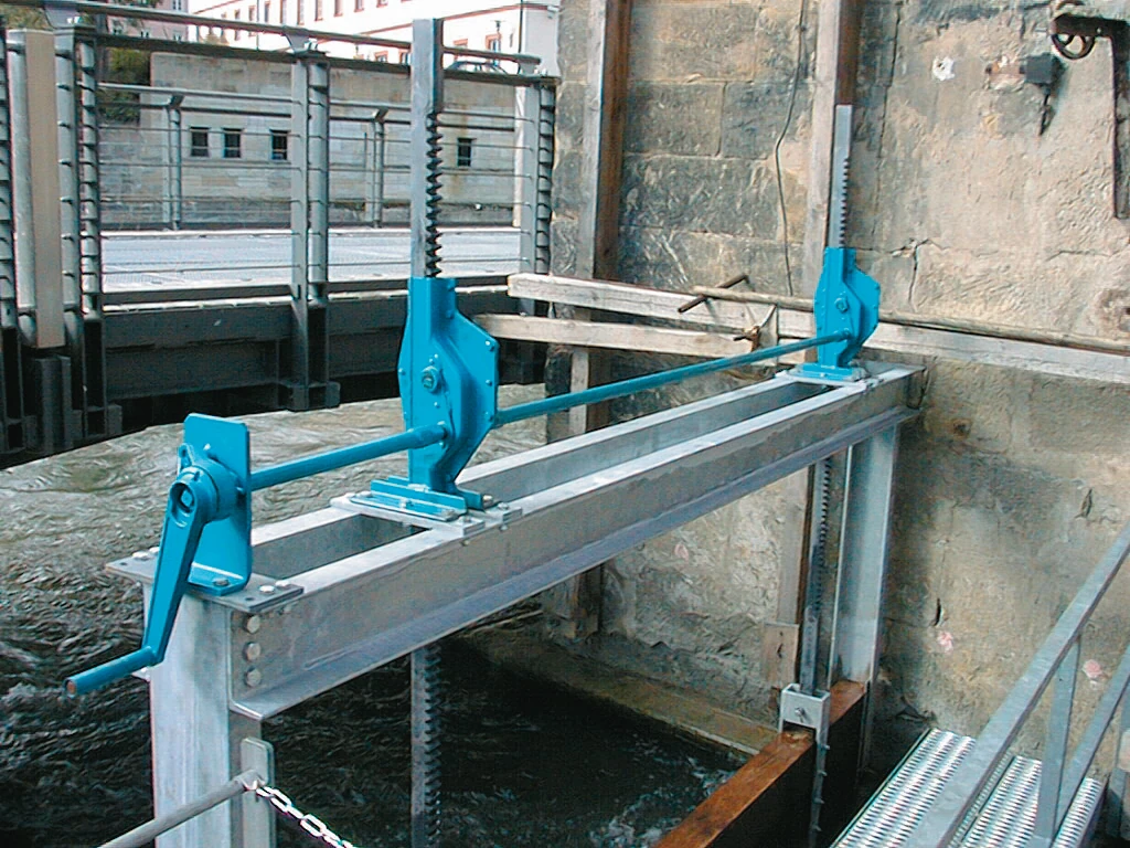 Die Sicherheitsfederkurbel sorgt dafür, dass die Schütztafel dauerhaft auf Druck geschlossen bleibt und sich gleichzeitig kontrolliert bewegen lässt. Durch die präzise gefertigte Zahnstangenführung läuft die Winde gleichmäßig und vibrationsarm. Nur 28 daN Handkraft sind bei voller Nennlast erforderlich – das ermöglicht eine kraftsparende und ergonomische Bedienung, auch bei wiederkehrenden Hebe- und Senkvorgängen.