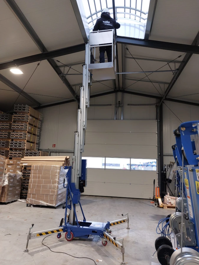 Die stabile Plattform von 0.67 m × 0.66 m bietet genügend Platz für eine Person und Werkzeug. Die maximale Plattformhöhe beträgt 7.40 m und erlaubt eine Arbeitshöhe von bis zu 9.40 m. Der elektrische 230-V-Antrieb arbeitet leise und zuverlässig, während das kompakte Design einen mühelosen Transport durch Türen und Aufzüge ermöglicht – perfekt für den täglichen Einsatz im Innenbereich.
