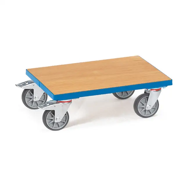 • Eurokasten-Roller in Winkelstahlkonstruktion mit Boden aus Holzwerkstoffplatte, bündig im Rahmen liegend