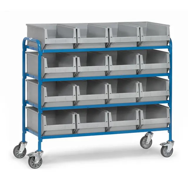 • 4 Etagen mit Holzwerkstoffplatten, Rand 10 mm hoch und 16 Sichtlagerkästen (LxBxH: 500/450 x 310 x 200 mm)