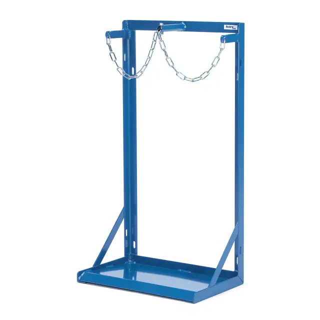 Der Ständer für 2 Flaschen mit einem Inhalt von 40-50 Litern und einem Durchmesser von 204-229 mm ist eine robuste und sichere Lösung zur Aufbewahrung von Gasflaschen. Der Stahlflaschenständerbesteht aus einer Profilstahl- und Stahlblechkonstruktion und ist in der Farbe blau RAL 5007 pulverbeschichtet.