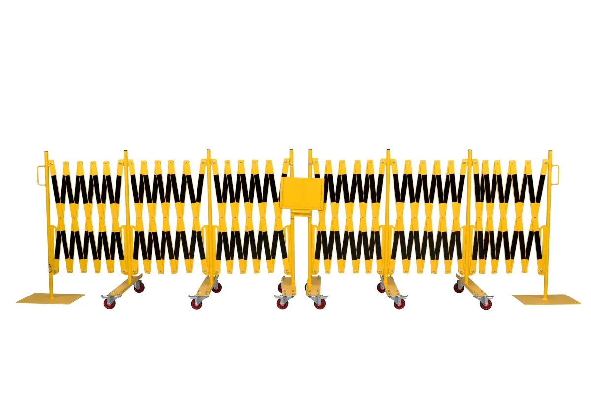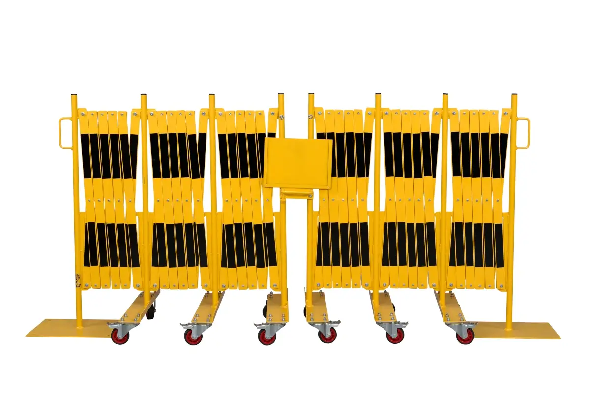SET bestehend aus 2 Stück Scherengitter mit je 8000 mm Länge (= 16000 mm) und je einem Standfuß, rot-weiß pulverbeschichtet + kugelgelagerten Rollen + Standfuß schwere Ausführung, + selbstsichernden Muttern + Handgriffen + mittig platziertem Überwurf zur Befestigung eines Infoblattes DIN A4