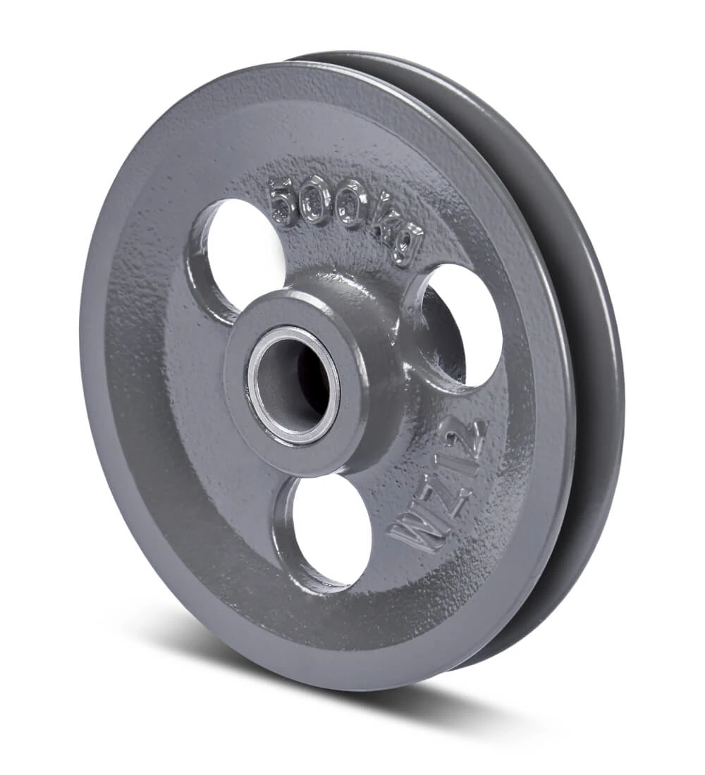 Das Rillenprofil dieser Umlenkrolle ist gedreht um eine definierte Profilierung mit glatter Oberfläche sicherzustellen. Die Lagerung wird durch eine Selbstschmierung mit Fettkammer realisiert.