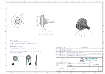 Die Seilrolle ist mit einer vormontierten Achse ausgestattet, wodurch eine schnelle und unkomplizierte Seilumlenkung ermöglicht wird. Sie ist mit einer Trockengleitlagerung bzw. einem Gleitlager ausgestattet. Die aus Stahl gefertigte Seilrolle sitzt mit der Lagerung auf einer geschliffenen Stahlachse. Sowohl die Seilrolle als auch die Achse bestehen aus dem Werkstoff S355J2 und sind galvanisch verzinkt. Das Rillenprofil ist gedreht und entspricht DIN 15061.