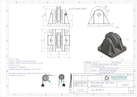 Im Handbetrieb hat der Rollenbock eine Triebwerkgruppe von 1Bm/3m. Im Kraftbetrieb entspricht die Triebwerkgruppe 1Am/4m. Der Bock wird aus Grauguss GG20 gegossen, in RAL 9006 lackiert und mit einer Seilrolle aus Werkstoff S355J2 komplettiert. Die Oberfläche der Rolle ist galvanisch verzinkt, und das Rillenprofil der Seilrolle wird entsprechend DIN 15061 gedreht.