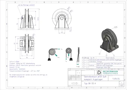 Der Seilrollenbock BR ist für hand- und kraftbetriebene Anlagen geeignet. Wahlweise ist er mit fettgefüllten, geschlossenen Kugellagern oder einer Trockengleitlagerung erhältlich. Die formschöne und extrem stabile Bockkonstruktion besteht aus Grauguss. Die Stahlseilscheibe rollt auf einer mit Spannhülsen im Bock gesicherten Stahlachse vibrationsfrei ab. Vier Befestigungsbohrungen im Bock ermöglichen die einfache Montage auf jegliche Konstruktionen.