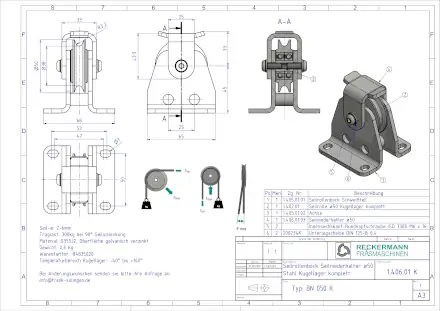 Der Rollenbock BN ist sowohl für handbetriebene Hebevorrichtungen als auch für kraftbetriebene Anlagen geeignet. Er ist wahlweise mit fettgefüllten, geschlossenen Kugellagern oder einer Trockengleitlagerung erhältlich. Seine extrem steife Bockbauweise besteht aus gebogenen Stahlplatten, die durch zwei Bolzen starr miteinander verbunden sind. Die Seilrolle rollt auf einer geschliffenen Stahlachse ab.