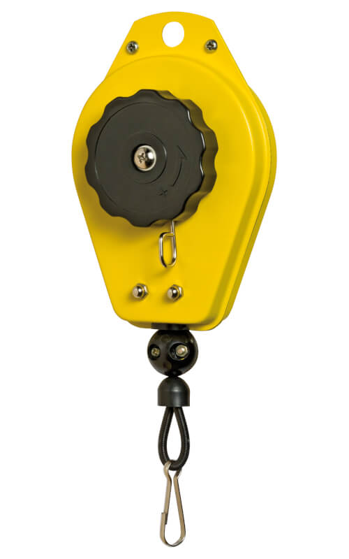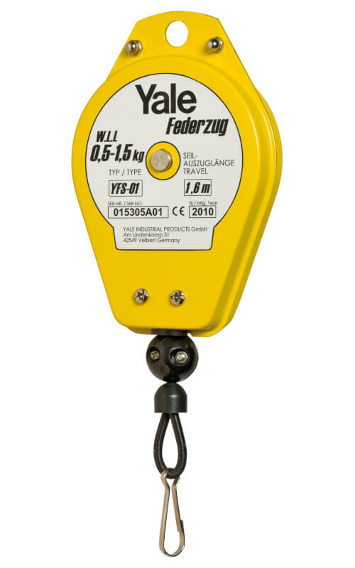 Der Federzug YFS zieht das Seil automatisch zurück in seine ursprüngliche Position, wenn keine entgegengesetzte Kraft aufgebracht wird. Um die Last in einer bestimmten Position zu halten, muss eine gewisse Kraft nach unten kontinuierlich ausgeübt werden. Der Federzug ist in einer gestanzten Stahlkonstruktion und einem pulverbeschichteten Gehäuse untergebracht, und verfügt über eine Seilführung aus verschleißfestem Kunststoff.
