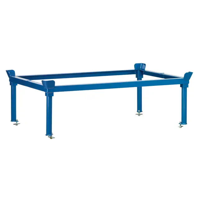 Das Fahrgestell für Aufsetzrahmen von Palettenfahrgestellen der Firma Fetra bietet ergonomisches Abstellen von Flachpaletten und Gitterboxen. Die Winkelstahl-Schweißkonstruktion mit Fangecken und stabilen Stützrohren, einsteckbar in Eckhülsen, ermöglicht eine sichere und stabile Lagerung. Die Pulverbeschichtung in Blau RAL 5007 sorgt für Langlebigkeit. Durch die Fußplatten können die Aufsetzrahmen fest mit dem Paletten-Fahrgestell verschraubt werden, was die Handhabung vereinfacht und die Sicherheit erhöht.