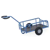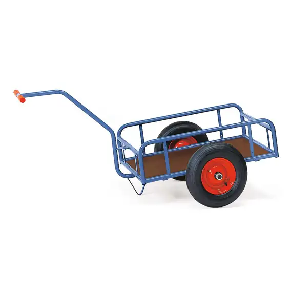 Der Handwagen mit Geländer von Fetra zeichnet sich durch eine robuste, pulverbeschichtete Stahlrohrkonstruktion in Blau RAL 5007 aus. Die Deichsel ist praktisch anschraubbar, und die Ladefläche besteht aus wasserfestem Sperrholz, was den Wagen besonders widerstandsfähig gegen Feuchtigkeit macht. Kunden können zwischen Vollgummi- oder Luftbereifung wählen, je nach Bedarf für eine optimale Anpassung an verschiedene Untergründe. Die Naben mit Rollenlager sorgen für eine reibungslose Fahrt.