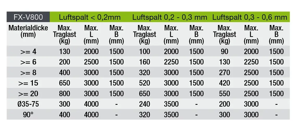 Flaig Luftspalttabellen für Lasthebemagnete FX