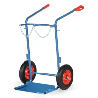 Die Stahlflaschenkarre von Fetra bietet eine robuste, pulverbeschichtete Stahlrohrkonstruktion und sichere Flaschenhalterungen mit Kettensicherung. Sie bietet die Wahl zwischen Vollgummi- oder Luft-Bereifung für Flexibilität auf verschiedenen Untergründen und Naben mit Rollenlager für eine reibungslose Bewegung. Einige Modelle verfügen über Schweißdrahtkörbe, die zusätzliche Lagermöglichkeiten bieten.
